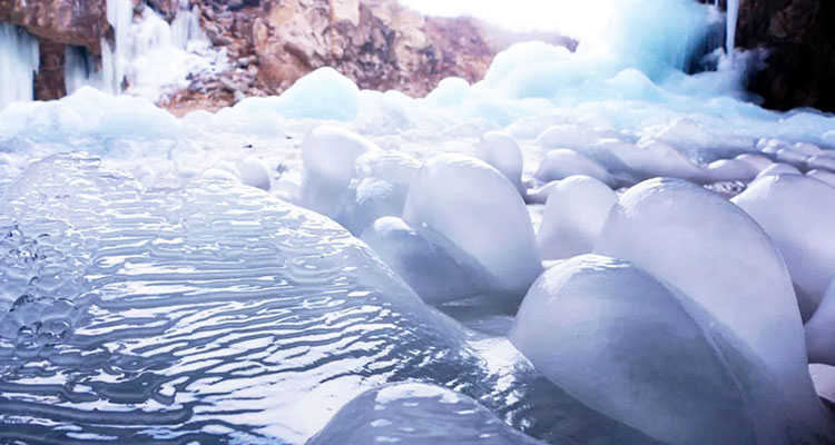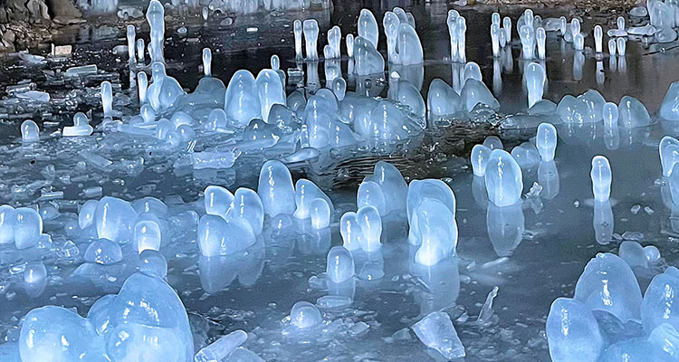 几处山洞,洞的形状呈口袋状,洞顶上滴下来的水,很快能结冰,逐步形成一整片的落地冰柱,或相拥一团,或独树一帜,高的大约60厘米左右,低的大约在5厘米左右,由于高矮不一,密布较大,如同茂密的蘑菇群,生长在山洞中。